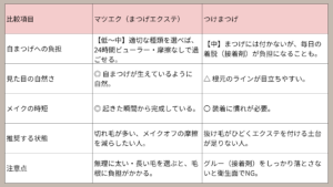 ここでは、目元の印象をキープするために比較検討される「つけまつげ」と「マツエク」のそれぞれのメリット・デメリットを整理していきます。